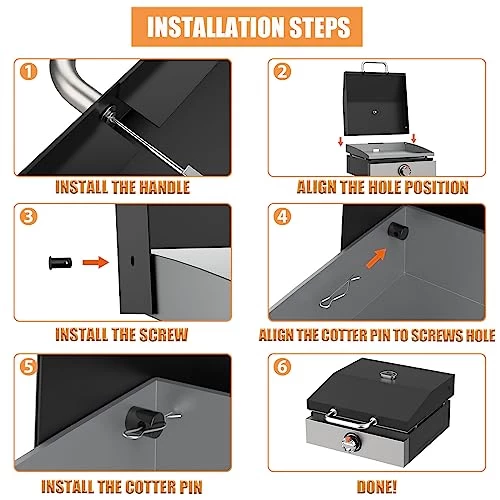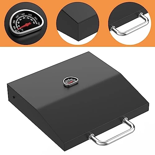 - High quality stainless steel handle: comfortable to hold and very easy to open and close the lid. Easy to install and clean.A must have for your blackstone 17 inch grill griddle! Package Includes 1-Pack griddle hood for Blackstone with temperature gauge and mounting screws.(Note: The screwdriver is not included).