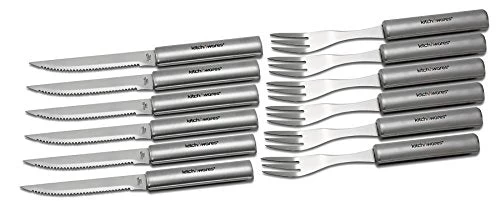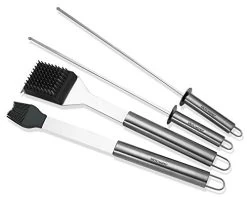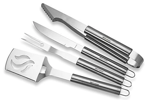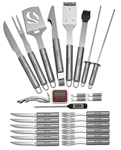 - RESTAURANT QUALITY: This set includes fork, tongs, knife, grill-cleaning brush, basting brush, steak knives, and corn holders. All made of high-grade stainless steel material. With metal hanging hooks and easy to clean and dishwasher safe. Tools will not bend, rust-free and nonstick material. Seamless steel design. Command the grill with high-quality tools that will impress your neighbors, friends, and family.
