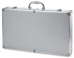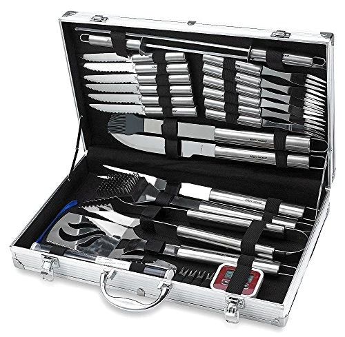 - EASY TO CARRY ALUMINUM CASE: This 31-piece barbeque set in an aluminum case with dual latches for secure storage. Carry this aluminum case and arrive at the cookout, tailgate party or picnic looking like a pro. Easily take it with you anywhere. It holds tools firmly while carried. No jingling.
