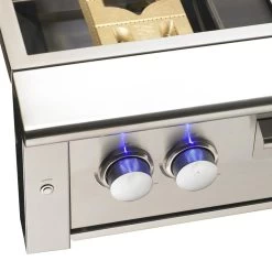 This 36-inch built-in natural gas grill is equipped with three commercial grade Cast Brass Burners burners rated for 26,000 BTUs each. The 945 square inch cooking area is covered with 9mm thick, heavy-duty stainless steel cooking grates. A ceramic briquette tray system sits under the grates, which absorb radiant heat from the burners, ensuring the grill provides even heat across the cooking surface. Stainless steel heat zone separators placed between the burners prevent heat from bleeding over, allowing you to cook foods at different temperatures simultaneously or use the grill in a two zone setup, with one portion for direct, high heat cooking and the other for cooler indirect cooking.