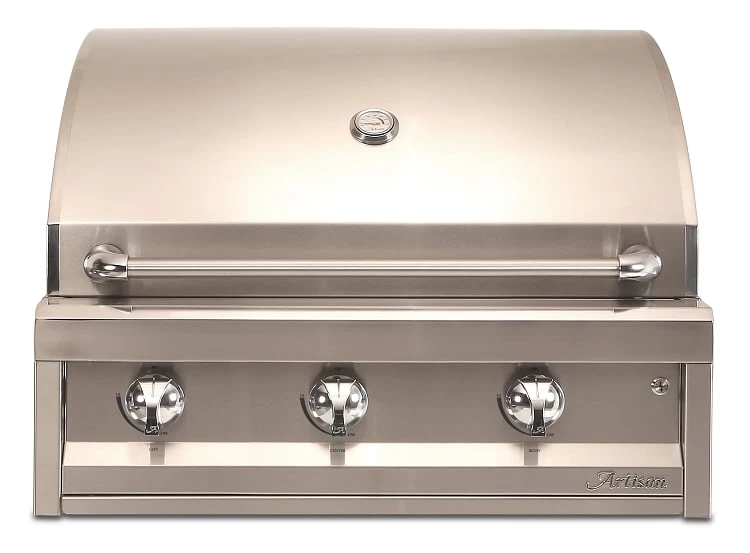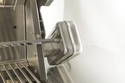 The Artisan 32 inch natural gas grill is built by the same professionals as well as on the same machines as the Alfresco gas grill line. It has large gauge stainless steel cooking grates, which are easy to clean and provide definitive grill marks. To help eliminate hot spots, ceramic tiles are used to distribute the heat evenly across the entire cooking area. The heat is provided by three 20,000 BTU U-burners, totaling 60,000 BTUs for the entire grill. The burners are made of stainless steel, and they will last much longer than burners made from cheaper materials. The exterior of the grill is just as impressive. The air curtain chimney design helps keep the burner control knobs cool even when the lid is closed. It contains a super reliable 110V AC ignition system that connects to standard house wiring. The chassis and double skin hood are constructed out of 300 series stainless steel, which makes it durable and easy to clean. The bull nose is embossed with the Artisan logo and the hood comes with a built in thermometer. This model also includes a rotisserie and infrared back burner.