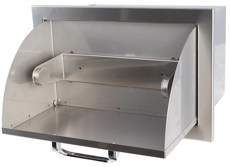 With the BBQ Island 260 Series Paper Towel Dispenser you will have your paper towels close at hand for clean up. It will be a handy and attractive installation to your outdoor kitchen. The dispenser is crafted from high quality 304 stainless steel with a solid frame and hinges. The welds are ground and blended with a brushed finish creating a complete look. This unit will be shipped with a white vinyl covering to protect surfaces during fabrication, handling and installation. Once it is in place, peel off the protective vinyl to expose the luster and quality of your superior American made outdoor kitchen unit, upgrade to the 300H handles for a more modern look. The 260 Series feature chrome plated handles that will give your outdoor kitchen a sleek look. The doors/drawers come flush on a box frame.