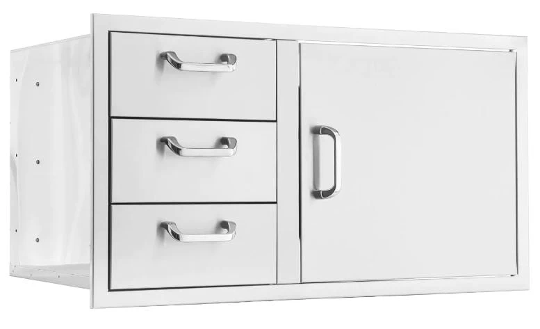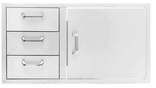 The BBQ Island 260 Series 39 Inch Rollout/Drawer Combo Unit is crafted from high quality 304 Stainless Steel with a solid frame, hinges and tracks. The drawer tracks are full length, galvanized steel with smooth action ball bearings that allow the drawer to open and close easily. The welds are ground and blended with a brushed finish creating a complete look. This unit will be shipped with a white vinyl covering to protect surfaces during fabrication, handling and installation. Once it is in place, peel off the protective vinyl to expose the luster and quality of your superior American made outdoor kitchen unit. The 260 Series features chrome plated handles that will give your outdoor kitchen a sleek look, upgrade to the modern look with the 300H Handles. The Rollout/drawers come flush on a box frame.