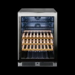 Sleek beverage center easily transforms into a wine fridge with added bamboo shelving