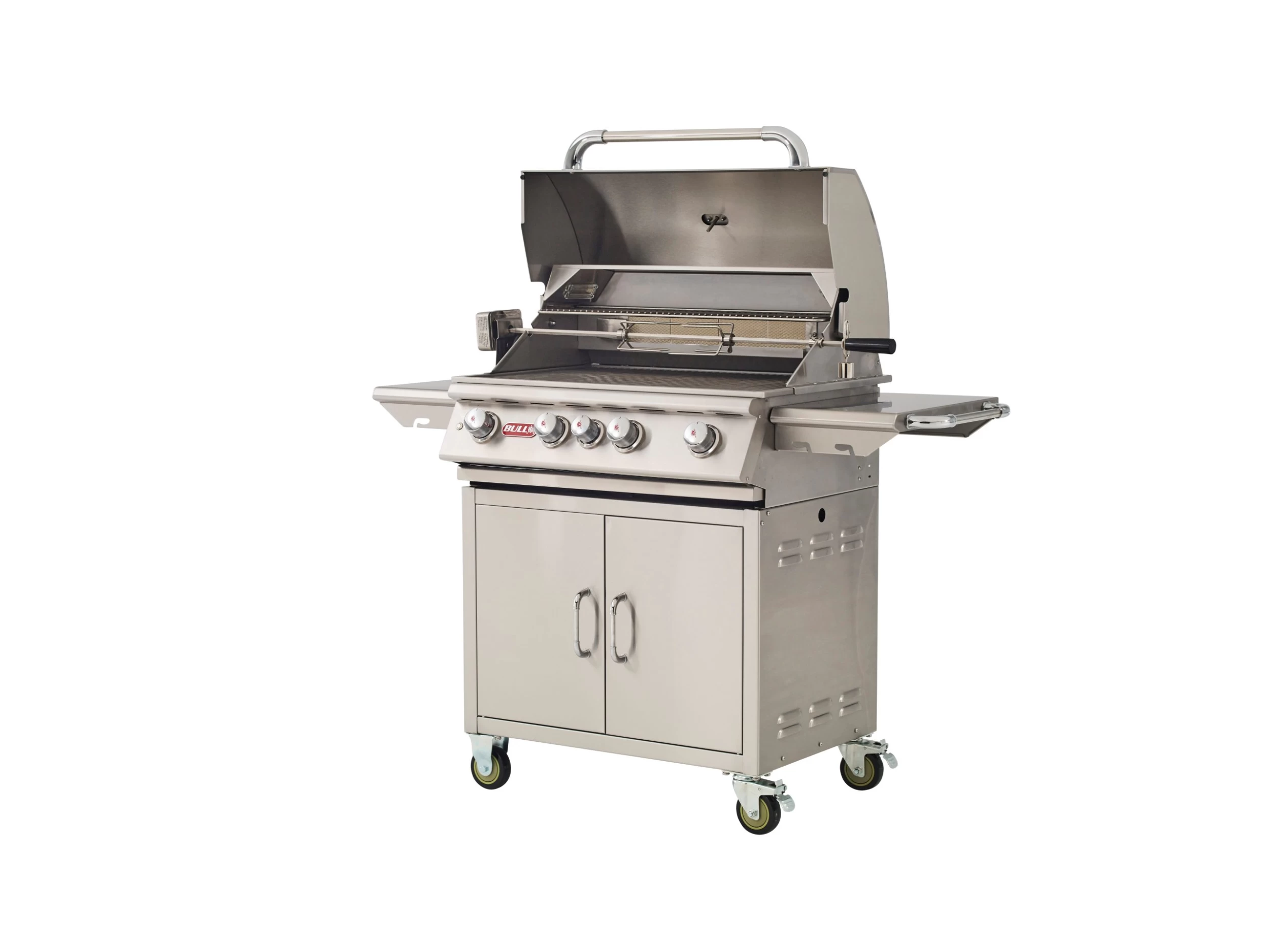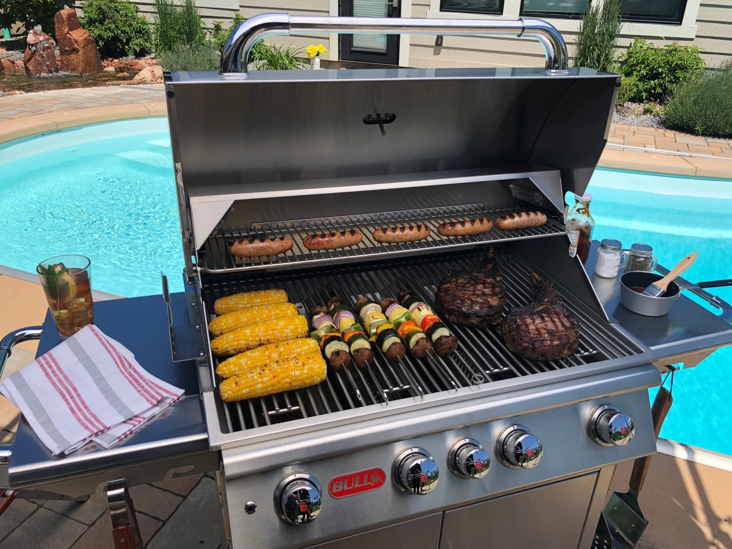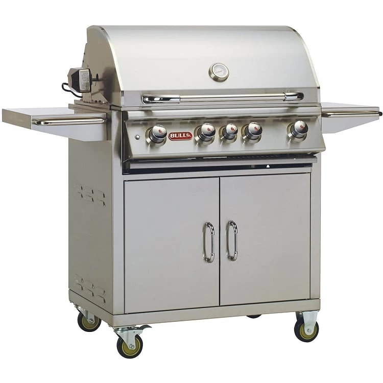 Bull Angus 4-Burner Natural Gas Grill On Cart: Nothing says quality beef like Angus. Maybe that is the reason Bull dubbed this gas grill the Angus as well. Constructed of 16 gauge, 304 stainless steel, this grill smokes the competition for backyard BBQ quality. Four 15,000 BTU burners that push 60,000 BTUs of total cooking power on the grilling surface, with an additional 15,000 BTU infrared rotisserie backburner for really high heat. With 5 Bull sure-lite gas valves, this natural gas grill performs above and beyond most gas grills. Four cast stainless burners and an impressive 600 square inch cooking area promises grilling perfection. The heavy duty thermometer helps keep track of food temperatures so your meal is a masterpiece every time. Five heavy duty, zinc knobs make operation easy. The rotisserie and chrome plated spit & rod help to enhance your grilling options, while the 210 square inch warming rack keeps your meal heated and ready to eat. The built-in lights make it easy for you to grill into the night. A full length handle and dual-lined roll top hood makes interior access safe and easy. The 2 side shelves are great for storing BBQ tools and accessories, and the 4 durable casters provide easy movement.