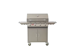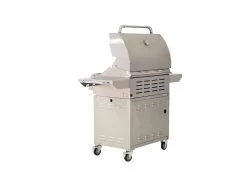 Nothing stands up to the affordable quality of a Bull BBQ grill. Constructed of 304 stainless steel, the Outlaw natural gas grill on cart features four porcelain-coated bar burners that push 15,000 BTUs each for a total of 60,000 BTUs. Grill your favorite steaks on the large 600 square inch cooking area or keep items warm on the 210 square inch warming rack for a total of 810 square inches of cooking space. Lighting your grill is easy with the four heavy duty, push-turn knobs with Piezo electronic ignition. The double-walled hood keeps the heat inside the grill and is constructed from one single piece of stainless steel for durability. The hood includes a heavy-duty thermometer to help you cook food perfectly every time on the stainless steel grill grates. The side shelves make prep work easy and allow you to hang towels nearby, while the cart provides storage for propane tanks, tools and accessories. Easily move the cart around with the locking casters. All Bull grills are CSA Gas Certified.