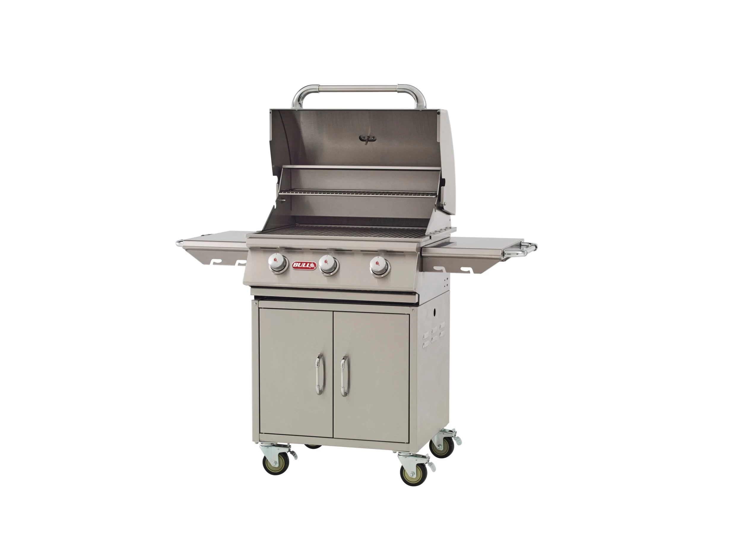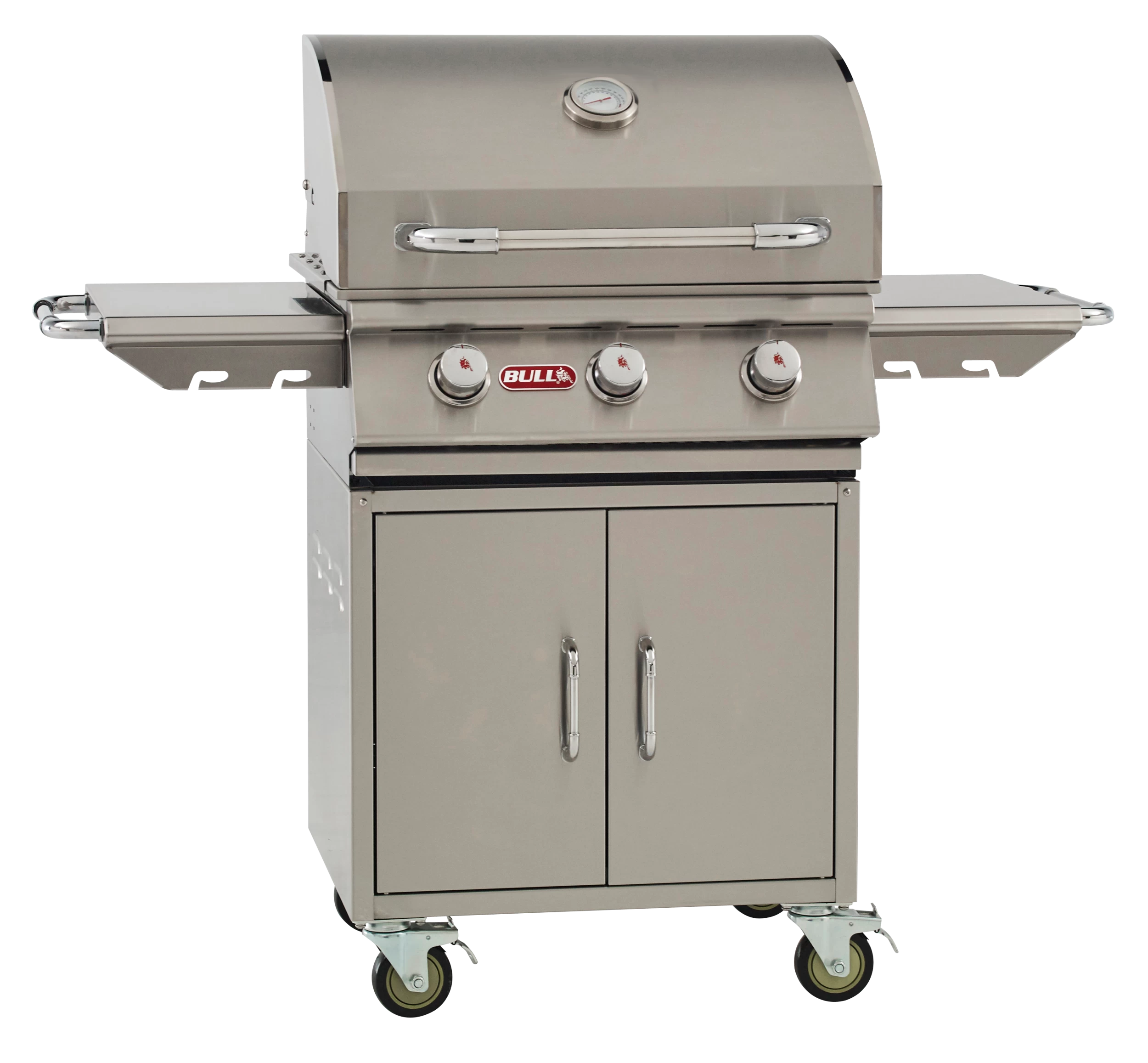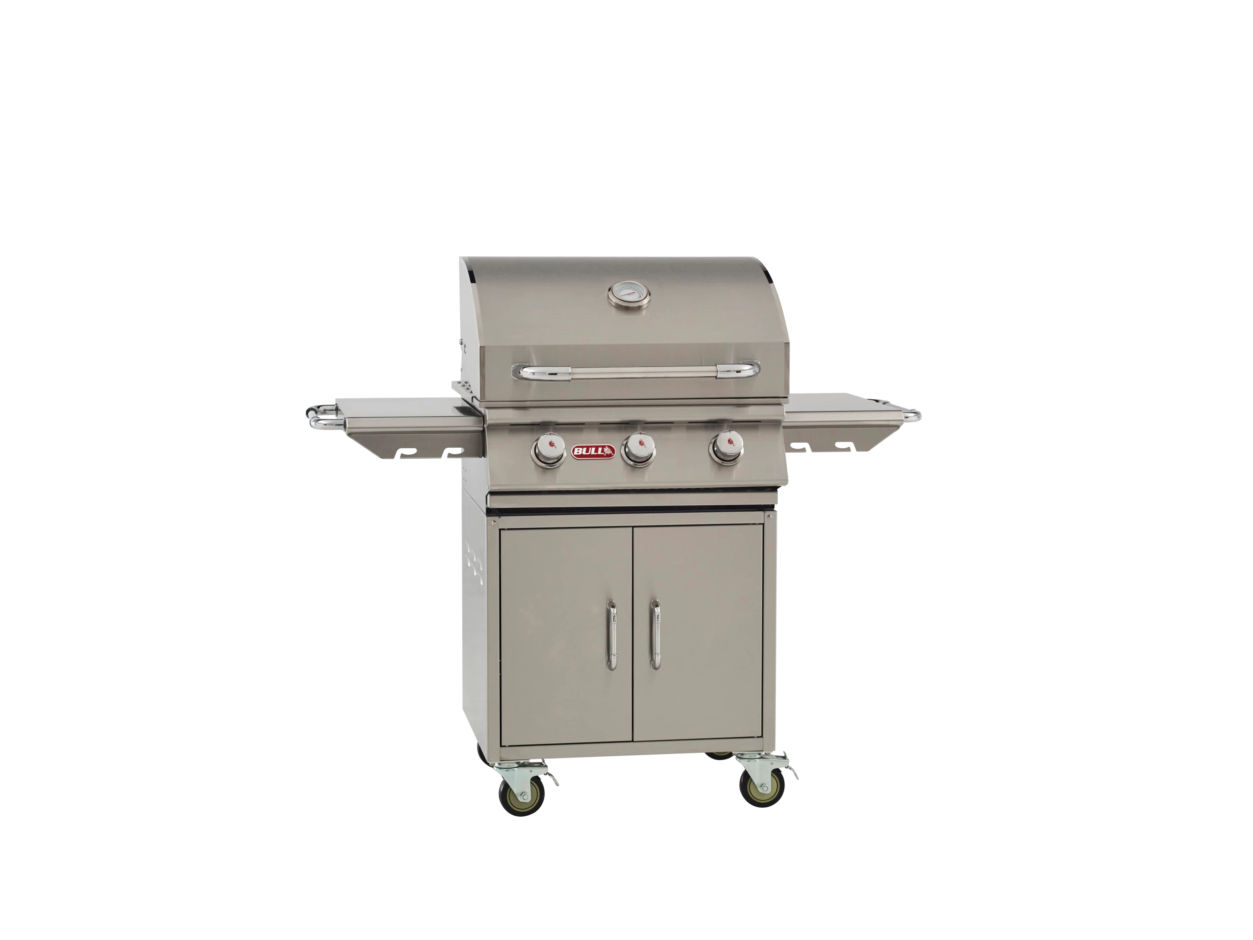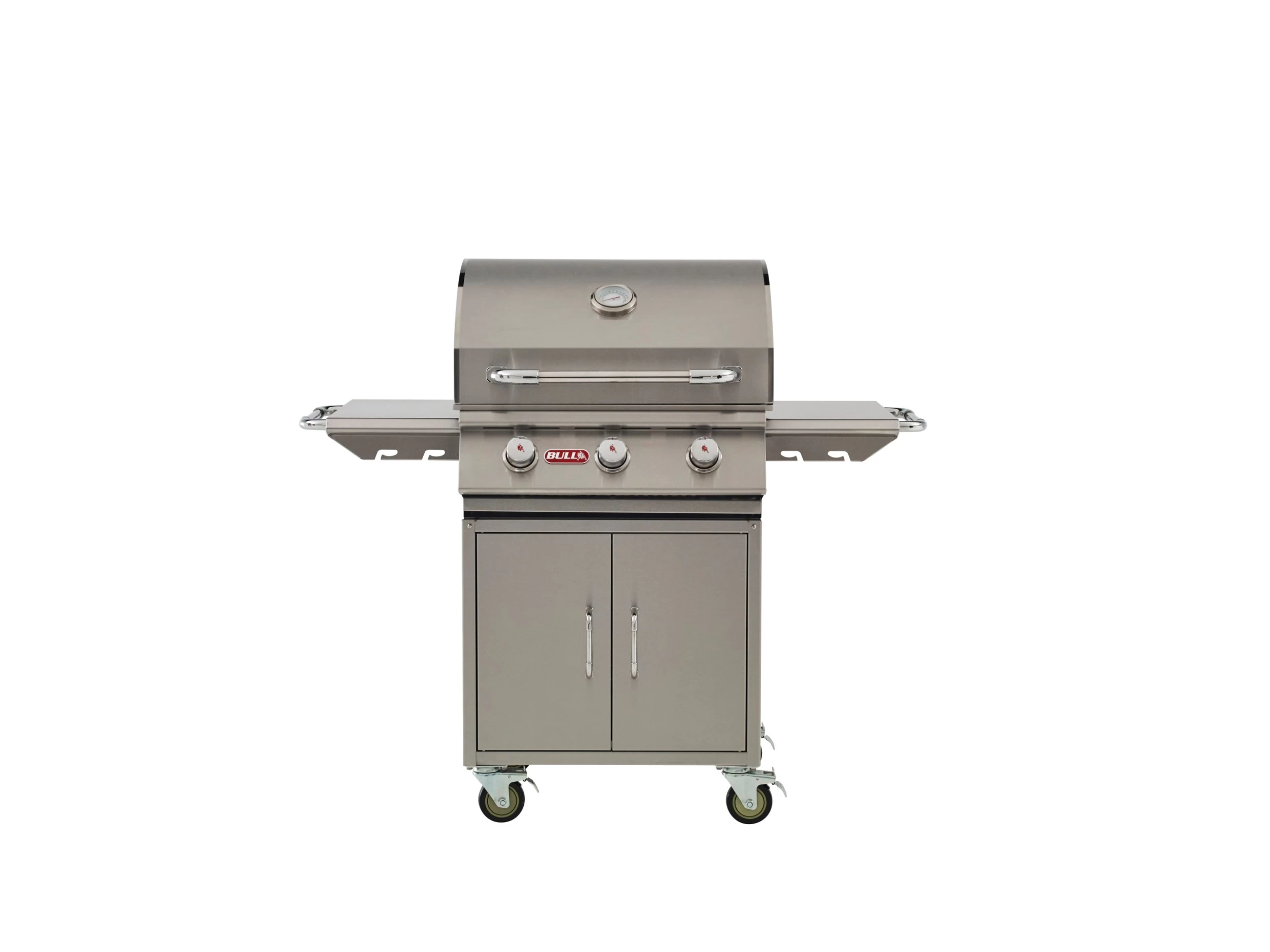 Nothing stands up to the affordable quality of a Bull natural gas BBQ grill. The Steer on-cart grill features 3-burner technology that evenly distributes heat. Enjoy the luxury of a cooking surface that boasts a spacious 564 Sq. In. Stainless steel construction means this grill will endure the elements with ease. This grill also features a grease tray for hassle-free cleanup. Durable zinc knobs can adjust the flames to push out an impressive 30,000 BTUs. An included warming rack allows you to keep food warm and ready for enjoyment at any time. The Steer BBQ grill cart is easy to move with 4 heavy-duty casters. All Bull grills are CSA Gas Certified.