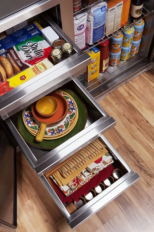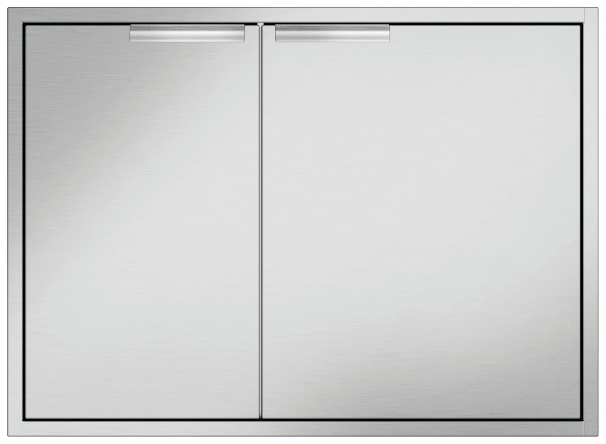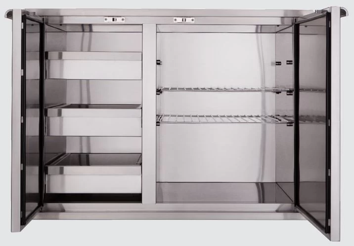 The DCS 42 Inch Sealed Dry Pantry DCS DP1-42 with soft close offers a professional design with indoor quality features that help create the ideal place to store all of your dry goods, cookware, and more in your outdoor kitchen. Enjoy the convenience of preparing and cooking the perfect meal without ever leaving your outdoor kitchen. The commercial-quality, 304 grade stainless steel construction is seamlessly welded for superior durability and weather resistance. A completely sealed gasket creates a dry environment which is safe from rodents, pests and moisture. The DCS DP1-42 also has three removable drawer inserts with full extension slides and two heavy gauge, wire shelves which can be adjusted into three positions for customizable storage capacity. The right side of the pantry features 7 cubic feet of storage, while the left has 5 cubic feet. This pantry may also be installed in a flush or raised mount configuration.