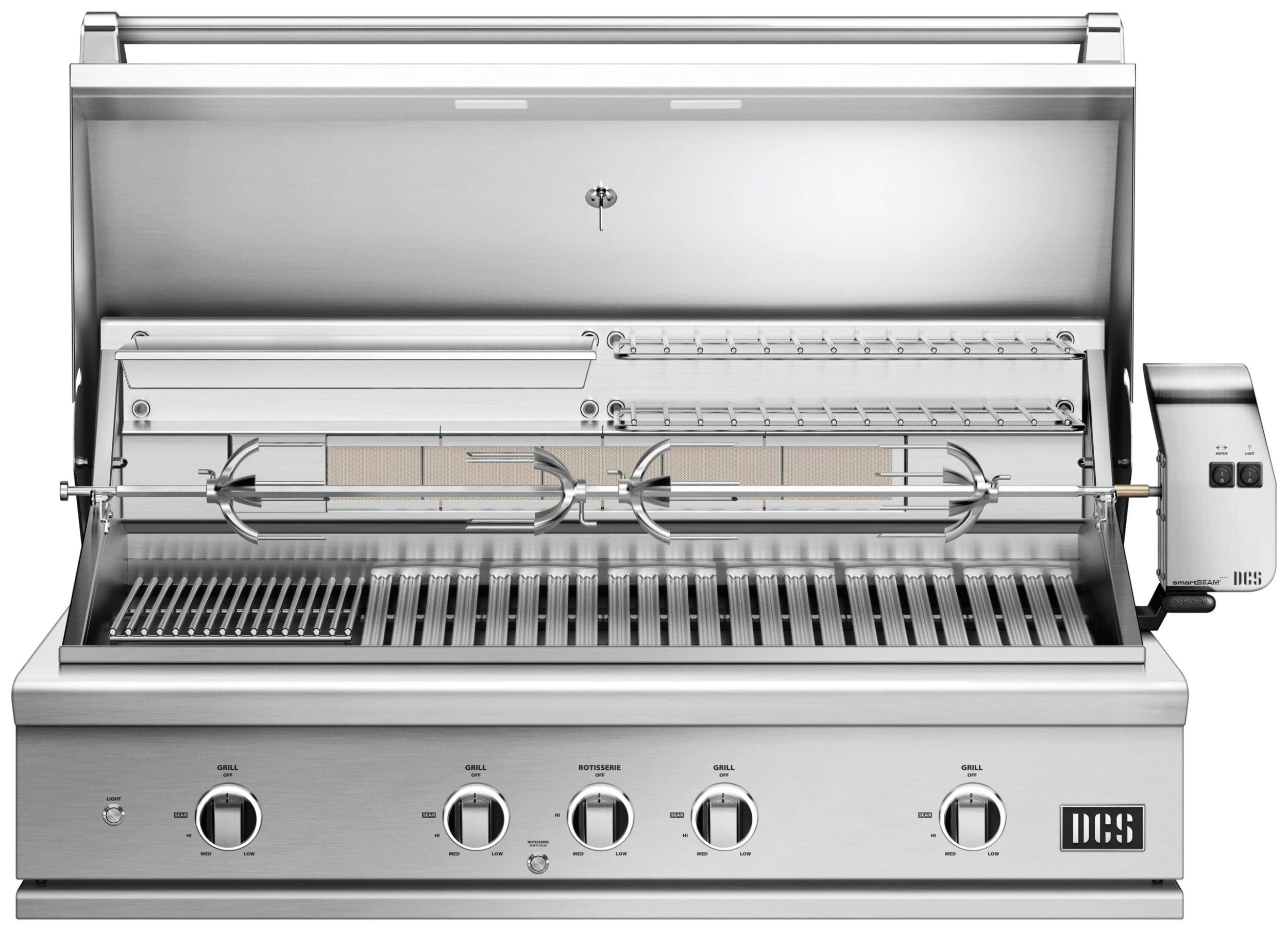 Heavy Duty Infrared Rotisserie – An infrared rotisserie burner provides controlled searing heat up to 14,000BTU. The heavy-duty motor easily turns a 50lb load, ideal when cooking for a big crowd. The rotisserie rod is conveniently stored under the drip pan handle.