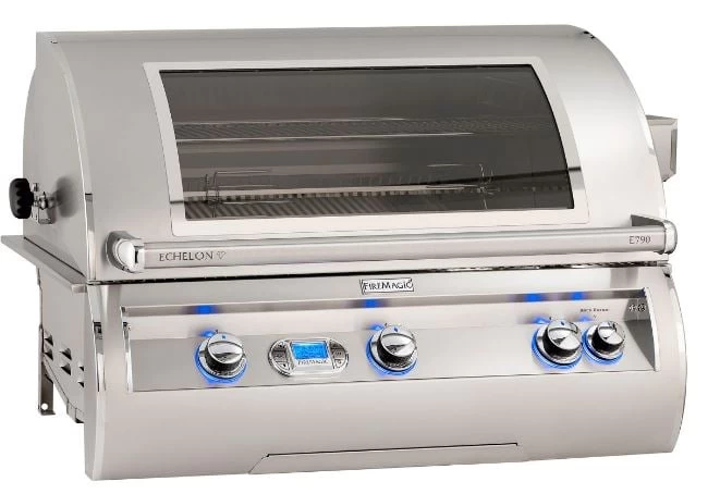The Echelon Diamond Series E790i built in propane grill is Made in the USA with the highest quality Stainless Steel on the market. Fire Magic has always been known for professional quality grills, giving the chef unparalleled heat to sear the meat (sealing in the natural juices) and cooking control (you can sear a steak and bake a cake) but the Echelon’s design has stepped all of that up a notch – or two!