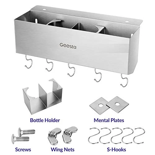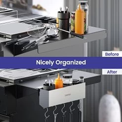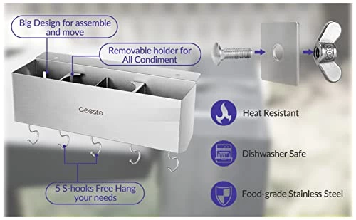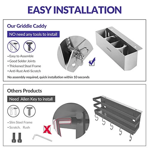 - 🍖 Premium Stainless Steel: Geesta griddle caddy is made of high quality stainless steel, durable and sturdy enough to give you a long-time use. Super strong spot welds help to hold more grill utensil and seasoning bottles, and the screws fit the brackets properly. (See the picture detail)