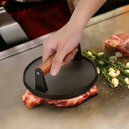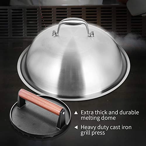 - [TOP QUALITY AND SUPERIOR MATERIAL] The dome is 2.5mm thick 304 stainless steel and heavy duty, It’s durable and easy to clean. The press is made with heavy-duty cast iron and the heat resistant wooden handle is solidly installed. Both of griddle tools are perfect for longer use.
