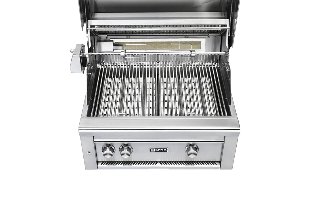 Inside, two 23,000 BTU Lynx Trident ProSear adjustable infrared burners allow you to sear thick-cuts perfectly, or throttle back to cook more delicate items. The two burners push 46,000 BTUs of total cooking power on the grilling surface. An advanced ignition system uses a hot element positioned directly above the burner port for reliably safe start-up to the 600 square-Inch main cooking grid while a secondary grid provides an additional 240 square-inches for a comprehensive 840 square-inches of overall grilling space The Lynx L30ASR-NG also has a dual-position internal rotisserie with heavy-duty, 3-speed motor and rear infrared burner to raise your cooking options to their full potential.