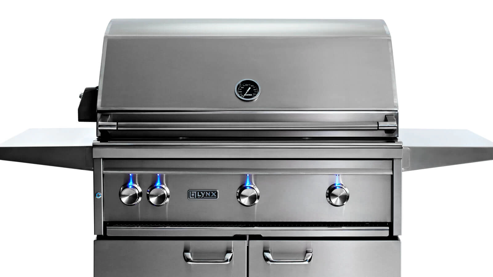 This Lynx grill on cart serves as a complete mobile outdoor kitchen with two heavy duty swing-out cart doors, magnetic latches and condiment shelves that are removable for easy cleaning. Commercial-grade casters make the unit easy to move and shelves can be folded down out of the way. Bring the power and performance of Lynx innovation to your outdoor cooking with the L36PSFR-2-NG Natural Gas Grill on Cart.