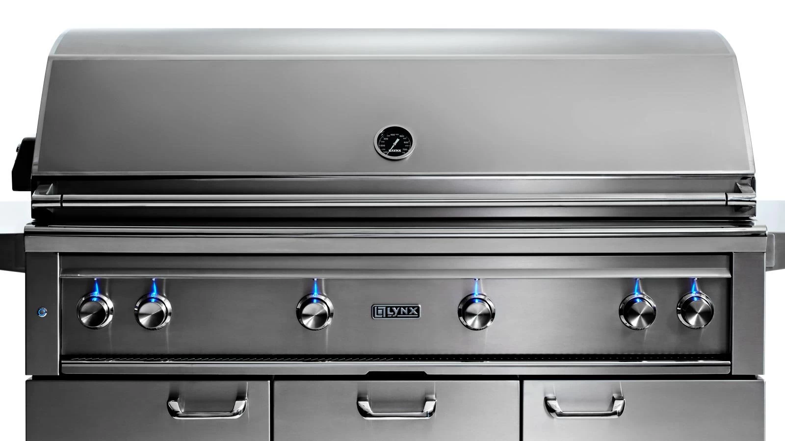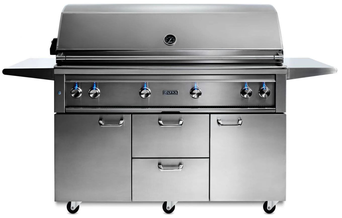 Lynx 54-Inch Freestanding Natural Gas Grill w/Infrared Trident Burner And Rotisserie L54PSFR-2-LP: Bring your outdoor grilling to new levels with the superior craftsmanship and innovative features found in this 54-inch natural gas grill from Lynx. The quality begins outside with gleaming, high-grade 304 stainless steel that is seamlessly welded to eliminate areas where grease and moisture can collect. A patented design deflects wind and allows the grill to vent properly, stabilizing critical surface temperatures when cooking in windy conditions.