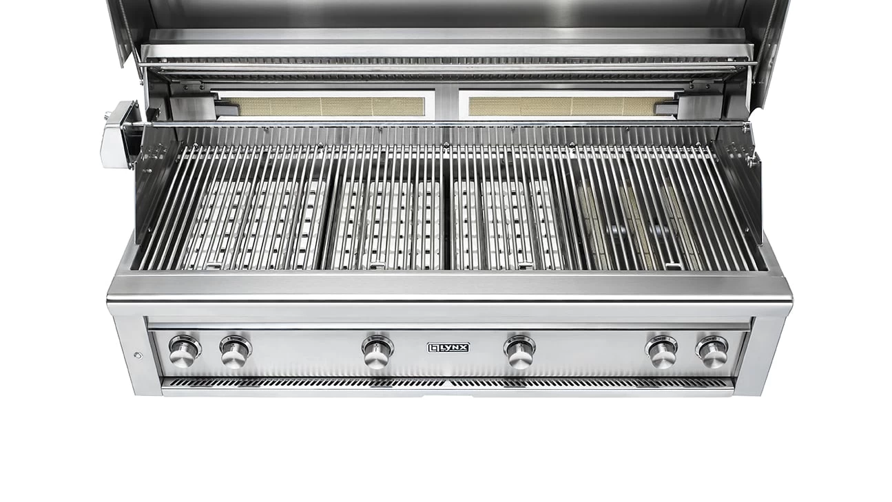 Inside, a 23,000 BTU Lynx Trident ProSear adjustable infrared burner allows you to sear thick-cuts perfectly, or throttle back to cook more delicate items while three 25,000 BTU ceramic burners deliver superior heat retention over tube burners so checking progress has minimal impact on cooking performance. The four burners push 98,000 BTUs of total cooking power on the grilling surface. An advanced ignition system uses a hot element positioned directly above the burner port for reliably safe start-up and a large capacity smoker box allows you to add extraordinary flavor to all the things you like to grill. Over the burner, an array of fixed position ceramic briquettes ensures precise, even heat distribution to the 1,110 square-Inch main cooking grid while a secondary grid provides an additional 445 square-inches for a comprehensive 1,555 square-inches of overall cooking area. The Lynx L54PSR-2-LP also has a dual-position internal rotisserie with heavy-duty, 3-speed motor and rear infrared burner to raise your cooking options to their full potential. Lynx made sure you have easy access to all these fine cooking features by adding lift assist and a handle that rotates fluidly as you raise and lower the hood.