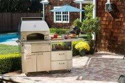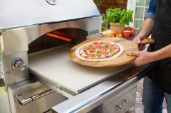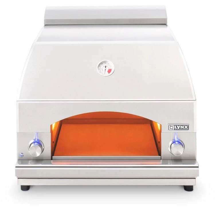 The Lynx Napoli 30 Inch Propane Gas Pizza Oven LPZA will be the centerpiece of your outdoor kitchen. This beautiful all stainless steel Lynx Pizza Oven can be used on the counter-top or built-in to an island for an instant upgrade to your outdoor kitchen. With the capacity to bake a 18 inch pie, the inside hosts a specially formulated concrete heat-retaining dome and 400 square inch cooking surface which is perfect for the high heat demanded. The variable infrared heating system is designed to quickly preheat to 700 degrees Fahrenheit, saving energy. The front door seals the pizza oven closed, focusing the heat on the pizza. Unique in the industry, the cooking surface pulls forward for easy access to last minute topping adjustments or pizza removal. Night-time pizza baking is no issue with blue LED control knob illumination and interior halogen light. The exterior is constructed of stylish and sturdy stainless steel with hand-polished mirrored edges for a professional look. Reversible chimney top lets you control where the smoke and heat go, so as not to mar walls or bother guests. An aluminum pizza peel is included so you can start baking fresh bubbling pies right away!