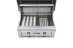 The Lynx Sedona 30 inch propane grill incorporates many of the same features found on their more expensive grills. This grill is heli-arc welded and does not use any mechanical fasteners. The precision welding forms pieces into a solitary integrated body of gorgeous steel, free of gaps and seams where moisture and grease can collect. Not only does this add structural integrity to the grill it also makes cleaning a lot easier. Despite the hood weighing over 30 lbs, the spring assisted hood lift enables you to open and close the grill with one finger. An internal super bright halogen light makes grilling at night as simple as grilling during the day and the blue LED illuminated control knobs let you see where they are set even in total darkness. The included sear zone is fully adjustable so you can sear a steak on it or grill low temperature foods. Many other grill’s sear zones are either off or on and the problem with those is that you end up having a large portion of your grill that you can only sear on but with Lynx’s variable sear zone you retain the ability to grill a larger range of foods.