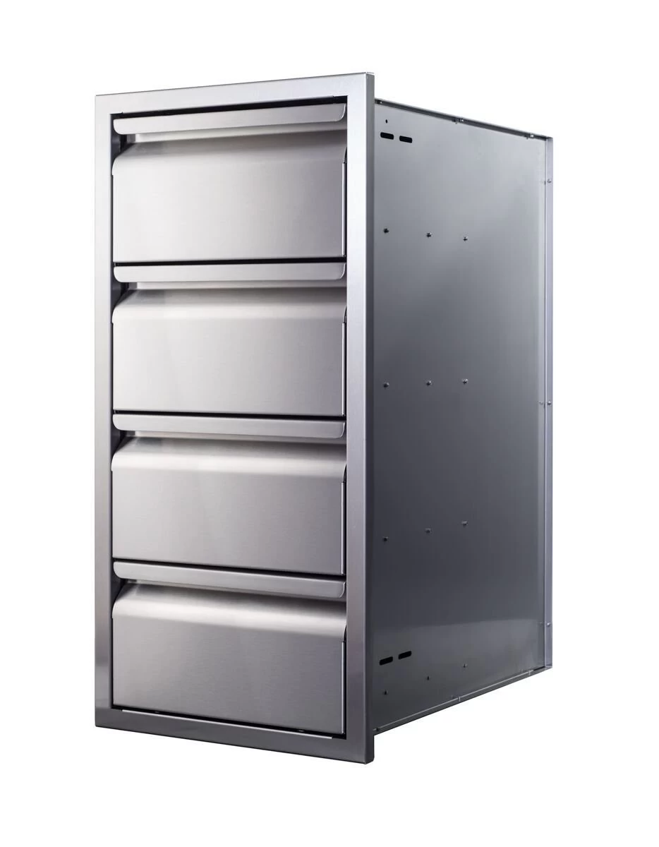 A variety of cabinet options provide two drawers to four drawers. Available in both 15” and 21” widths, these units will fit most any outdoor kitchen application. There are even cabinets which incorporate the grill controller for space savings and convenience, as well as an option with a trash compartment.