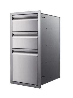 A variety of cabinet options provide two drawers to four drawers. Available in both 15” and 21” widths, these units will fit most any outdoor kitchen application. There are even cabinets which incorporate the grill controller for space savings and convenience, as well as an option with a trash compartment.