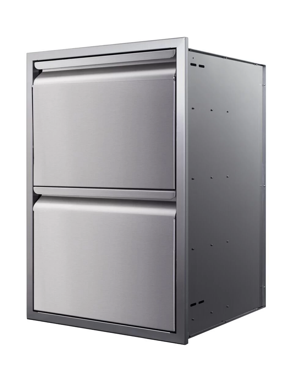 A variety of cabinet options provide two drawers to four drawers. Available in both 15” and 21” widths, these units will fit most any outdoor kitchen application. There are even cabinets which incorporate the grill controller for space savings and convenience, as well as an option with a trash compartment.
