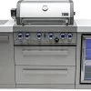 Upgrade your grilling game with the Mont Alpi 4-burner Deluxe Island. The MAi400-D features four burners, an infrared side burner for searing and boiling, and an infrared rear burner for the ultimate rotisserie experience. The grill is made of 304 Stainless Steel components and comes with a rotisserie kit, full-size weather cover, and a granite matching chopping board. LED knob lights and bright internal cooking lights provide perfect vision and precision control.