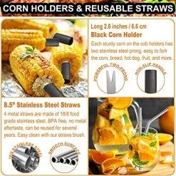 - 【Premium & Practical Grill Kit】Summer is here, whether you’re planning a small backyard cookout for the family or a big barbecue party, this functional grill essentials you need. The set of bbq accessories includes barbecue spatula, grill tong, bbq fork, grill cleaning brush, replaceable head of grill brush, basting brush, 4 grill skewers, 8 corn holders, 2 grill mats, 4 metal straws, straws cleaning brush and a portable carrying bag. It has never been easier to get started even for newbies.