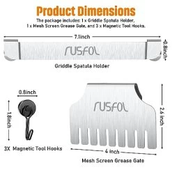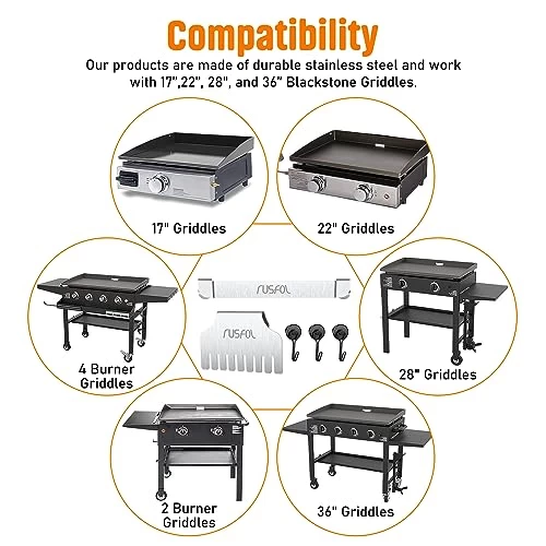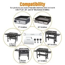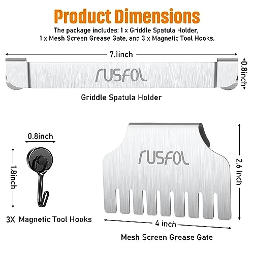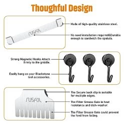 - High Quality and Compatibility: Our products are made of durable stainless steel and work with 22’’, 28″, and 36’’ Blackstone Griddles. The package includes: 1 x Griddle Spatula Holder, 1 x Mesh Screen Grease Gate, and 3 x Magnetic Tool Hooks.