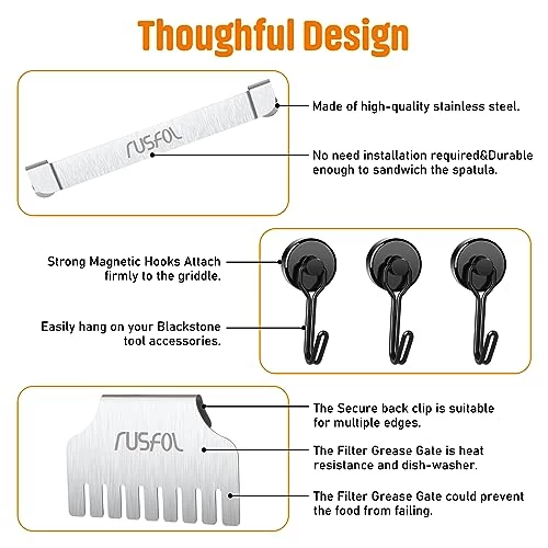 - Strong Magnetic Hooks for Blackstone Accessories: Our Magnetic tool hooks fit BBQ griddle accessories well. They attach firmly to the griddle and let you hang your Blackstone tool accessories easily, such as spatulas, tongs, forks, ladles, etc.
