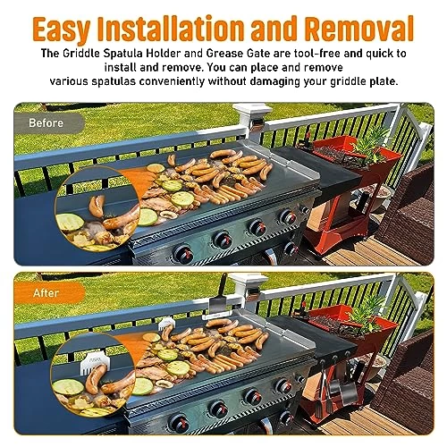 - Easy Installation and Removal: The Griddle Spatula Holder and Grease Gate are tool-free and quick to install and remove. You can place and remove various spatulas conveniently without damaging your griddle plate.