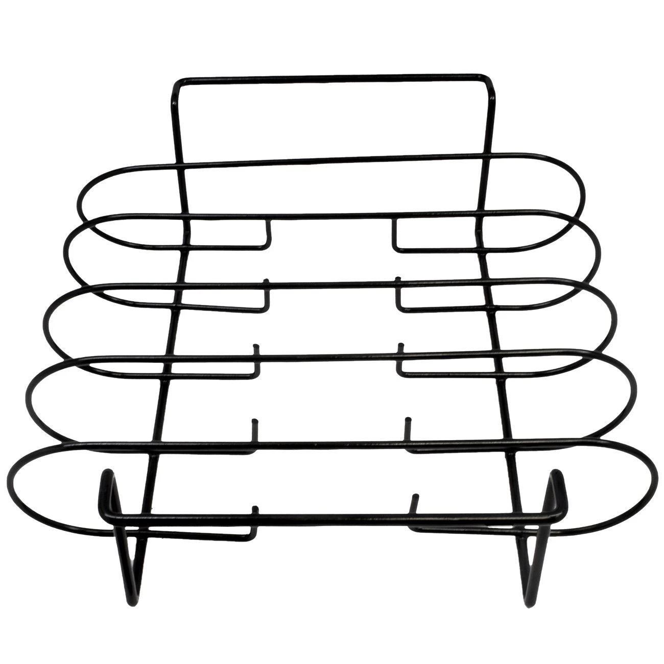 It is a fundamental tool for BBQs, grilling, slow cooking, or even cooking indoors. The steel rack is easy to use and fits everything from small baby backs to jumbo beef ribs. It is sturdy enough to keep even the largest rib racks from tipping over. Fits most grills, such as, Charbroil, Weber, Kenmore, and Forge. It can also fit into an oven or smoker where only limited space is provided. The rib rack has a steel construction with a porcelain coating. It can be quickly cleaned by hand with mild soap and water. This high performance rib rack is a must for any kitchen and perfect gift for the grill master in your life! The rack measures approximately 11.375″ L x 9.75″ W x 3.25″ H.