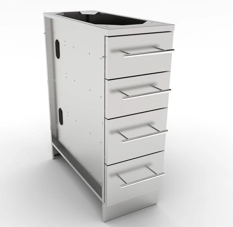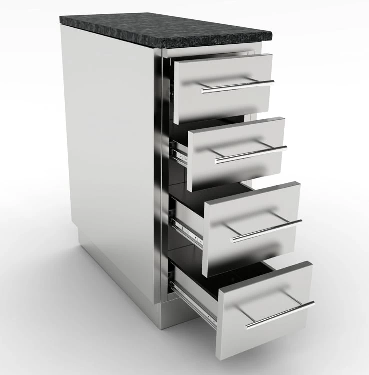 The Sunstone 12″ Multi-Drawer Cabinet features Four Stacked Drawers with Two Larger Height Drawers at Base, and Two Smaller Height Drawers at Top. This cabinet is specifically designed to provide the perfect storage solution for all your BBQ Utensils, Towels, and Accessories for your Outdoor Kitchen Island.
