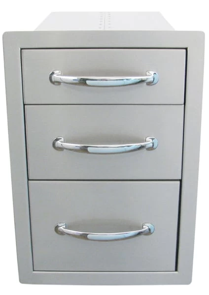 The Sunstone 14 Inch Flush Triple Access drawer are fully enclosed and provide ample storage for all your bbq tools and accessories. These flush mount triple drawers feature commercial grade 304 grade stainless steel construction with chrome plated handles and commercial grade drawer glides for easy opening. Sunstone Grills island components provide the complete professional solution for outdoor kitchen builders at an affordable price. Be the envy of your neighborhood with Sunstone grills full line of outdoor kitchen and bbq island accessories.