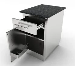 The Sunstone 18″Combo Left Swing Door with Adjustable Shelf and Top Drawer. Cabinet offers lots of needed storage space for your outdoor kitchen island and easy access. with the Center Shelf, you can store and categorize multiple items to keep it clean and tidy. the large single door gives a clear access to all your BBQ Cookware, and stored items. The Center Shelf is Removable to allow larger items.