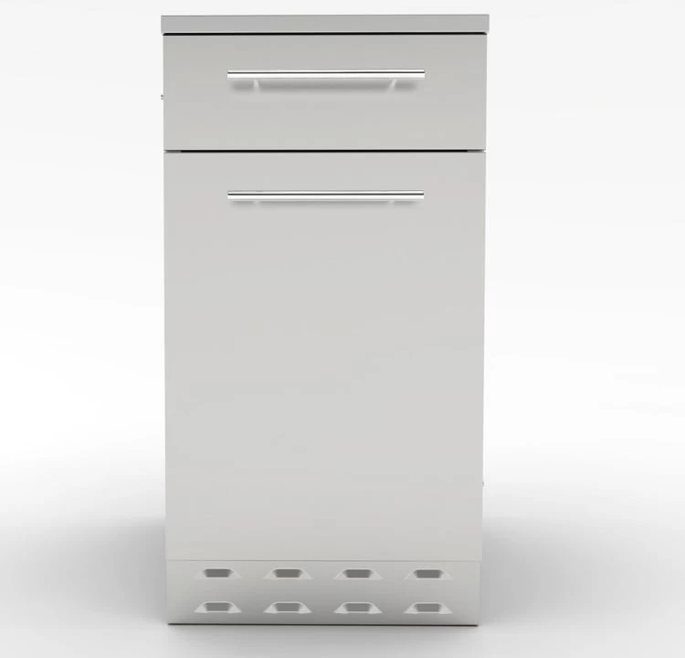 The Sunstone 18 Inch Propane Tank Drawer Storage Combo is ideal as a Multi-Purpose cabinet, with the option for inserting a Propane Tank with correct gas venting through front Kick Plate Vents. Another option is to purchase up to Two Trash Bins and place them Front to Back, use one as Waste and other for Recyclables. With this combo unit you can adjust the Trash Ring to its Up Position and add a loose trash bag, or even insert a Plastic Trash Bin. All your smaller items, tools and additional BBQ parts can fill the top drawer for use as your Utility all in one Cabinet.
