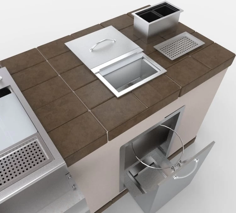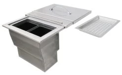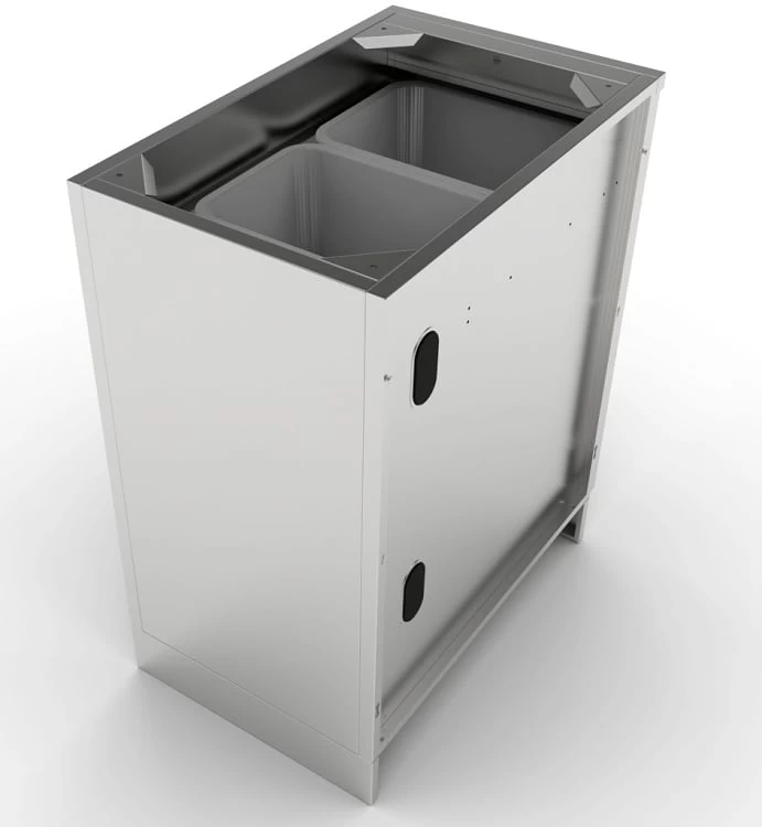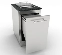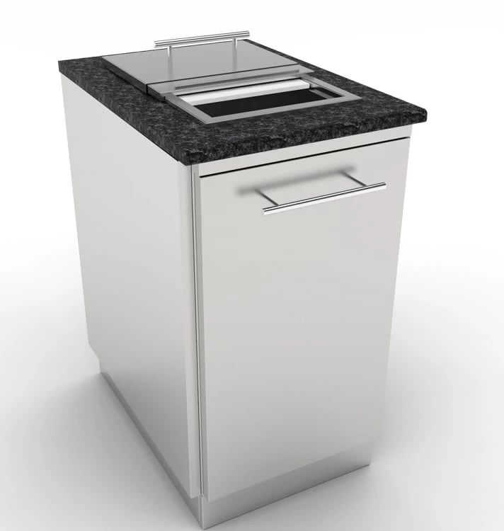 The Sunstone 18 Inch Full Height Trash Drawer Cabinet with Two Large Top Loading Trash Bins Front and Back. Great for Combo Bins for Recyclables, or Compost and Waste Trash. Add to this cabinet the Sunstone Trash Chute – Item No. A-TRCH with Cutting Board and Cocktail Bins with Sliding Cover, and you have your self an all-in-one solution for all your Prep and Clean Serving Center.