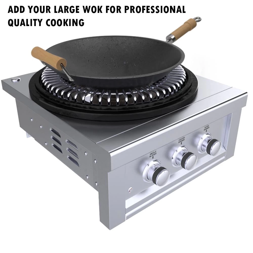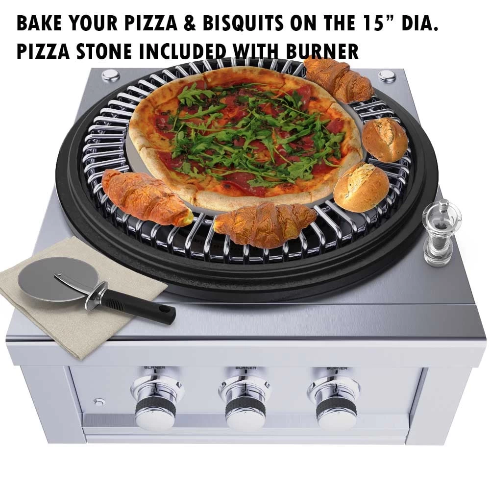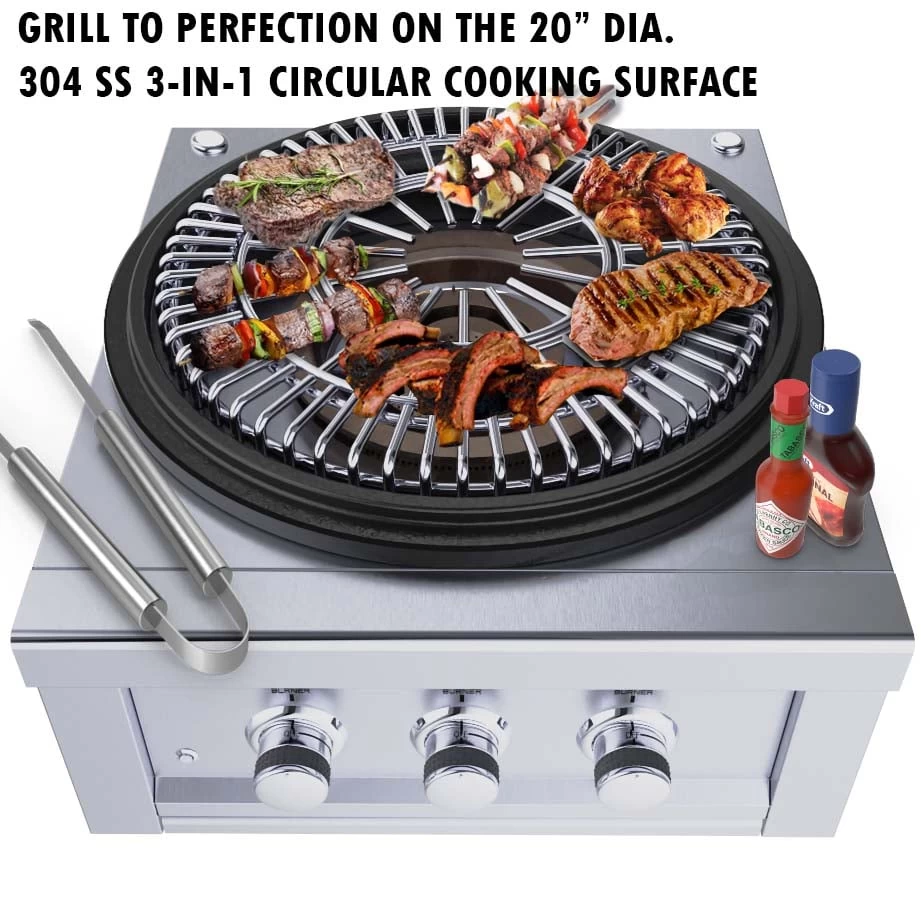 Sunstone Series 24″ Power Cirqueβ’ Burner features Three heavy-duty Cast-Iron Cirqueβ’ burners totaling up-to 65,000 BTU recessed into a Ceramic Heat Insulator making this the ONLY true circular power burner available in the market. All 18 Gauge 304 Stainless Steel Construction and Solid 304 Stainless Steel Raised Circular 3-IN-1 Cooking Grates – all with its adjustable all surround flame, and raised cooking grates provides better airflow around the burner for superior performance. The Power Cirque Burner Features High-Cooking Heat, enough for the largest WOK Stir-Fry Pan Cooking, Large family Grilling or Pizza Lovers even insert the massive 19β Solid Steel Griddle for unlimited ways to cook. Mount the optional Cold-Water Pot Filler on either Left or Right for easy Stock-Pot filling or use with any Wok, Cover your cooktop with the included large Vented Cover with Adjustable Smoke/Heat Exhaust and built-in Temperature Gauge. Light-Up your work space the front LED Accent Light and never miss a beat while your grilling it up for the whole family in any way you wish β the Power Cirque Burner has you covered.