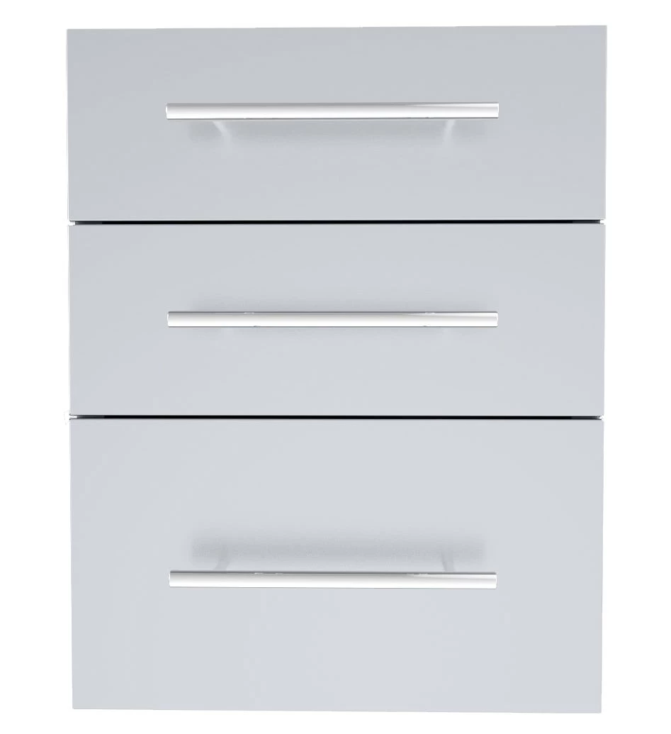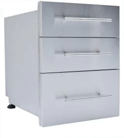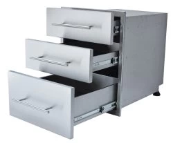 The Sunstone® Designer Series, Raised Style 23 In.Height by 18 In.Width Triple Drawer provides a double storage space in a weather sealed box, to store away oversized grill tools, Towels and BBQ accessories. This Double Drawer is specially designed to be the same consistent 18 In.Width as all other Designer Series components – which provide a true designer friendly appeal. The component is raised off the finish wall 1-1/2 inches so to work with most any island structure including Veneer Stone, Stucco and as extra 4 inch deep inside flange to work with all Masonry Stone types. In Addition the frame is designed with an additional 1/16 inch frame around all four sides of component, plus adjustable Self-Leveling Legs in back. Which make all components multi-configurable Vertically & Horizontally, and are styled to match with Sunstone® Cabinet Island products, with both Cabinet Island and individual Designer Component combinations.