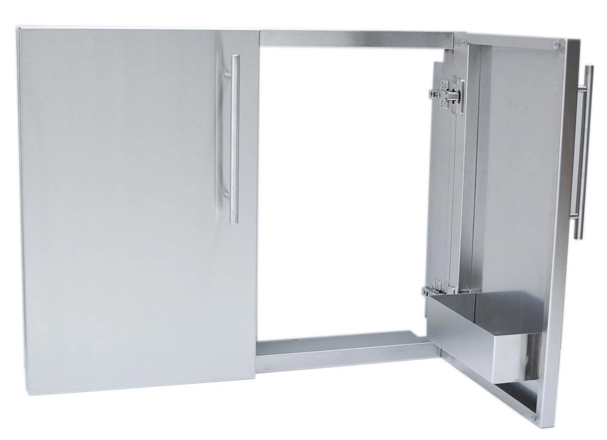 The Sunstone® Designer Series, Raised Style 30 inch Width by 23 Inch Height Double Door with inside Shelf per each door accommodates oversized grill tools and spices. The Double Doors are specially designed to be the same consistent 23 Inch height as all other Designer Series components – which provide a true designer friendly appeal. The component is raised off the finish wall 1-1/2 inches so to work with most any island structure including Veneer Stone, Stucco and as extra 4 inch deep inside flange to work with all Masonry Stone types. In Addition the frame is designed with an additional 1/16 inch frame around all four sides of component. Which makes the components multi-configurable Vertically & Horizontally, and are styled to match with Sunstone® Cabinet Island products, with both Cabinet Island and individual Designer Component combinations.