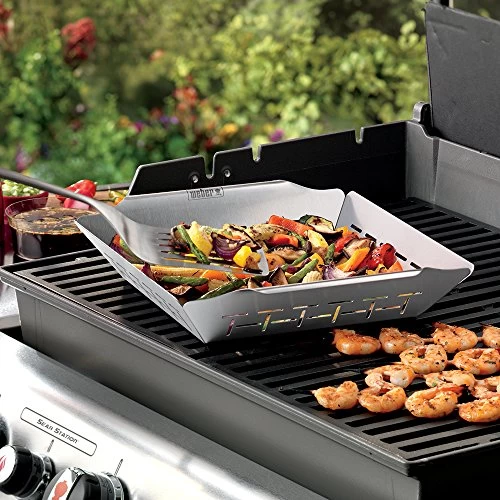 Details: A grill basket gets your Weber grill primed for side dishes. Add chopped veggies to the pan and place it on the grill alongside the main entrée. Makes grilling delicate or small foods easy. Fits all Weber charcoal, gas and electric grills.